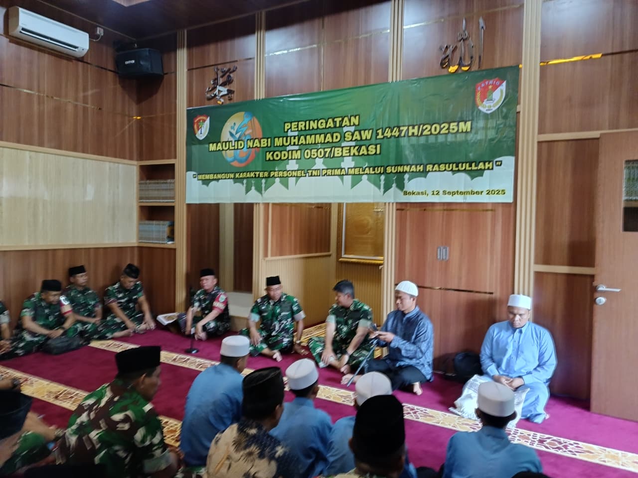 Pijarberita.com-Bekasi, Markas Kodim Bekasi menggelar acara Maulid Nabi Muhammad Saw 1447 H di Musholla Al Jihad, Markas Kodim Jalan Veteran Bekasi, Jumat. Kegiatan yang mengangkat tema “Membangun Karakter Personil TNI Prima Melalui Sunnah Rasulullah” diikuti oleh prajurit dan ASN Kodim.