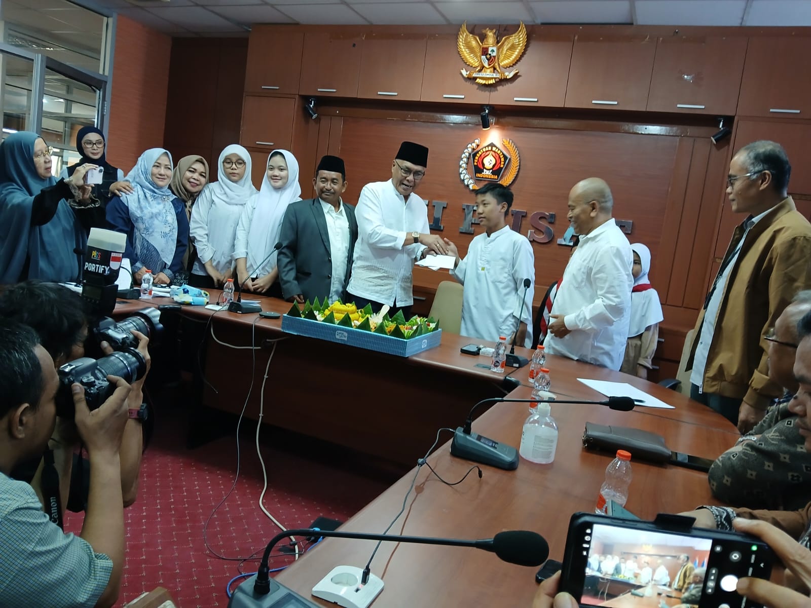 Sebanyak 72 anak yatim piatu dari Yayasan Al-Hikmah dan Yayasan Harun Ar-Rasyid Jakarta Timur yang didampingi pembinanya memadati markas PWI Pusat. Tasyakuran dibuka oleh Dr. Firdaus Turmudzi, S.Ag., M.Hum dengan menyampaikan kalimat sejuk, jika kita mendapat hikmah dari Allah maka syukurilah.
